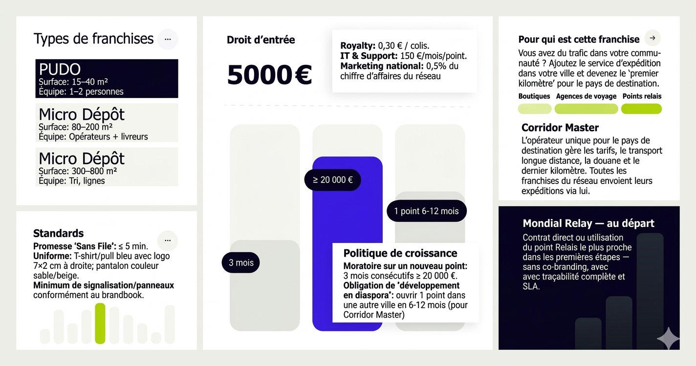 Créez un point d’expédition officiel pour votre communauté. Économie simple : droit d’entrée 5 000 €, redevance 0,30 € par colis, service informatique 150 €/mois/point. Promesse *No-Queue* ≤ 5 min. Au lancement, Mondial Relay est autorisé.